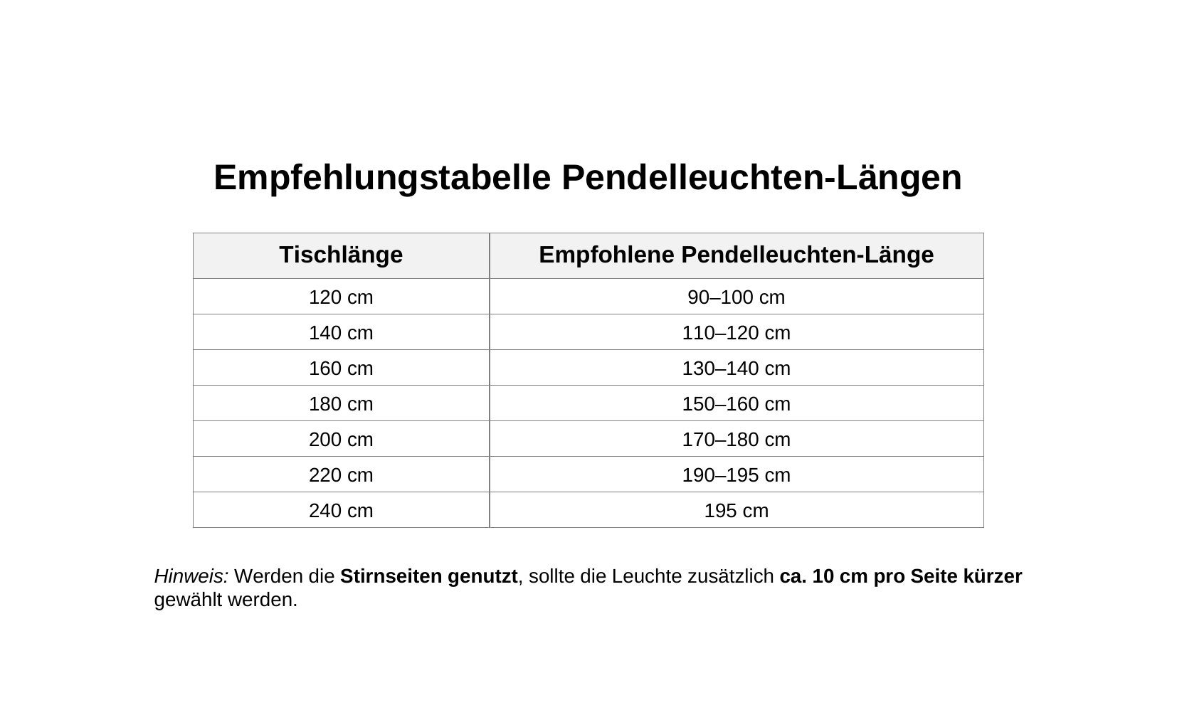 Eine zu lange oder zu kurze Pendelleuchte kann das Gesamtbild deines Essbereichs stören. Ist die Lampe länger als der Tisch, wirkt das Design unausgewogen. Ist sie genauso lang, kann es passieren, dass man sich an den Stirnseiten den Kopf stößt.